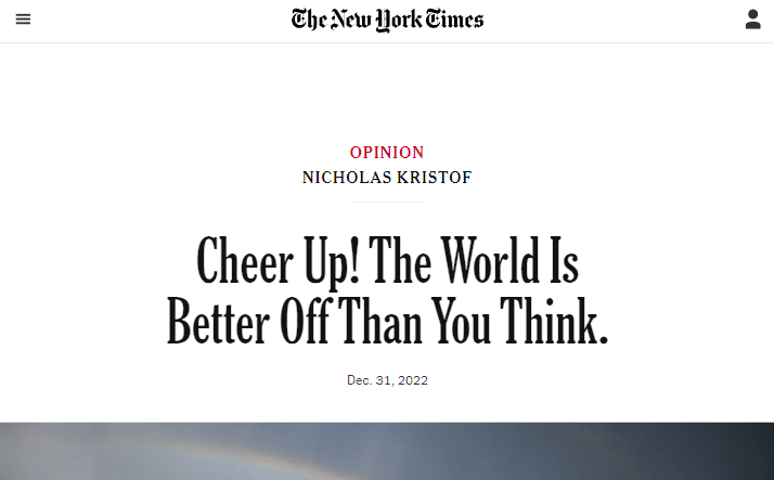 As New York Times columnist Nicholas Kristof put it: “Enough with the doom and gloom! Our planet may be in better shape than you think.” He continues, “Until the pandemic, I wrote an annual column arguing that the previous year was the best in human history. I can’t do that this year. But I can suggest that, broadly speaking, much is going right—and this may still be the best time ever to be alive.”