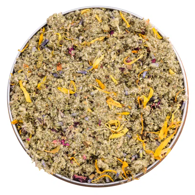 Peppermint, Mullein, Red Raspberry, Lavender, Mugwort, Rose Petals, Damiana, Catnip, Calendula, Lobelia, and Vanilla Bean.