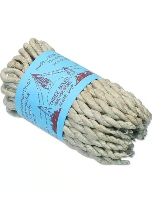 Three Mixed Nepali Rope Incense is blended from three types of incense powder: camphor, saldup and asta sugandha. Rolled by hand in lokta paper. Use for meditation in your home, stupa or temple. This type of dhup is typical in Newari community and almost each and every Nepalese home uses it. It is also referred to as Newari Dhup. Each bundle contains approximately fifty 4 inch ropes. You can burn rope incense by lying it flat on a bed of sand or ash, which allows the entire rope to burn safely and completely or use a rope incense burner. Handcrafted in Nepal.