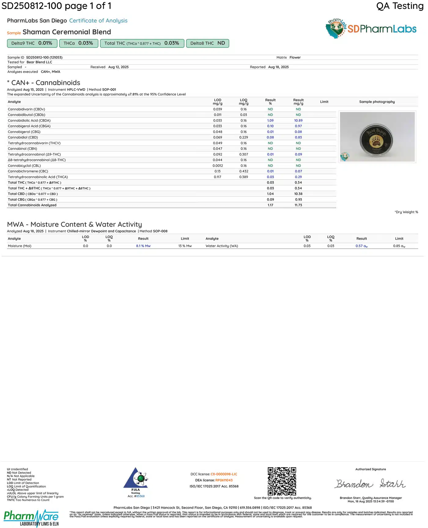 Absolutely love this product and the way it makes me feel. Shaman Ceremonial Blend is definitely my favorite blend. Love the taste and smell and how smooth it burns. Smoking this before bed has been giving me mega lucid dreams. Thank you, Bear Blend.